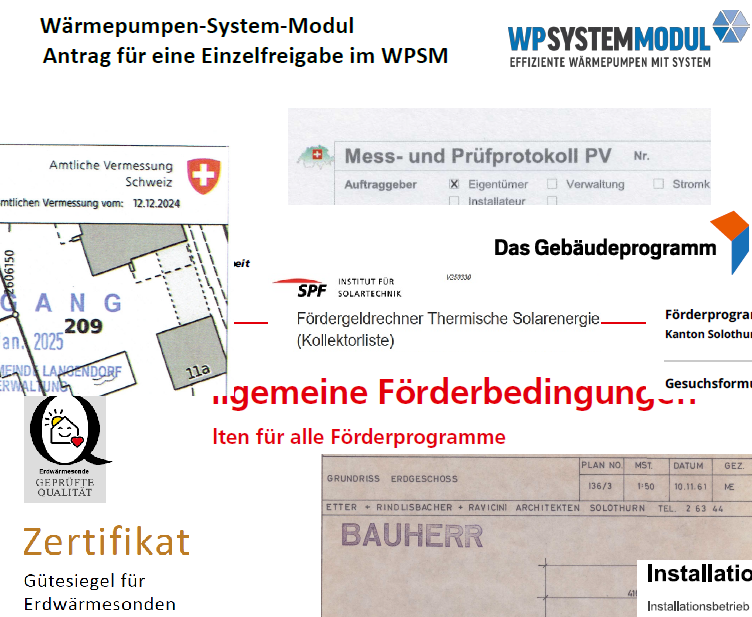 Ich habe die meisten Förderungen und Gesuche/Bewilligungen selbst beantragt inkl. der jeweiligen Schemata und Pläne, teilweise aber auch durch dem Elektriker/Solarteur oder den Heizungsbauer. Meiner persönlichen Erfahrung nach sind die entsprechenden amtlichen Stellen Hilfsbereit. Lediglich die elektrischen Gesuche müssen zwingend von den Installateuren beantragt werden. Vorsicht, nicht jeder kann das. Unbedingt im Vorfeld schriftlich klären wer das macht und auch machen darf.